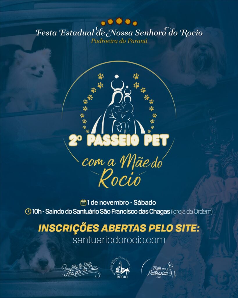 No dia 1º de novembro, às 10h, traga seu pet para esse momento especial! Vamos sair em carreata do Santuário de São Francisco das Chagas até o Santuário do Rocio para celebrar o amor pela Mãe do Rocio e pelos nossos bichinhos.